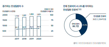 사회경제적 측면에서 만성질환자들의 증가는 장기간의 관리 필요에 따른 개인의 의료비 부담을 가중시키고 국가 건강보험 재정 악화의 주요 원인으로 작용합니다.