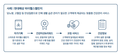 임직원의 종합적 건강증진을 위한 만성질환 및 스트레스 관리용 프로그램으로, 정신상담위주의 기존 아날로그형 EAP 상품과 달리 임직원 개인의 식이 습관, 라이프로그 데이터 등을 반영하여 개인 맞춤형 자문을 제공하는 종합 서비스입니다.